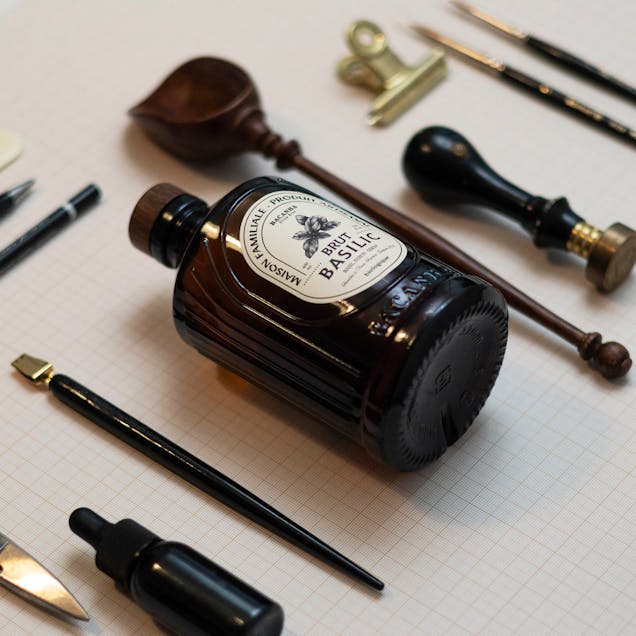 Choix typographiques assumés, créations d’illustrations sur-mesure au crayon, cannage sur bouteille en verre, bouchon à tête bois plus bec verseur intégré au goulot.