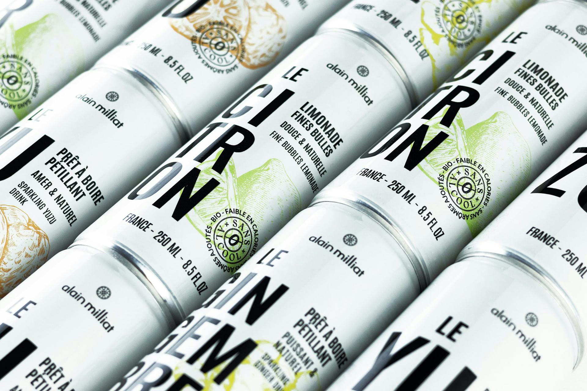 Nous avons modernisé l'ensemble avec une typographie linéale plus impactante, créant une esthétique luxueuse et moderne avec des couleurs rappelant les jus originaux.