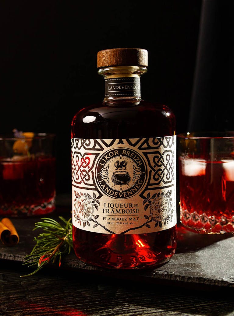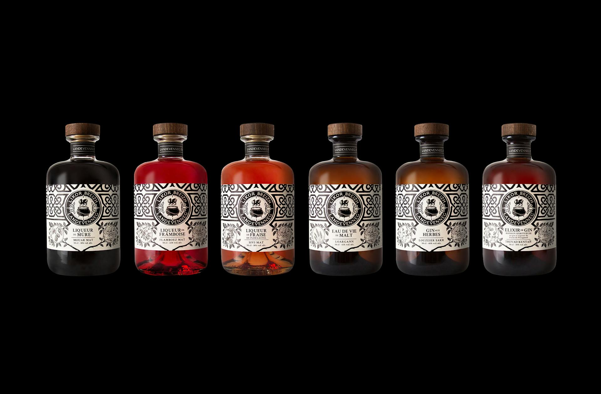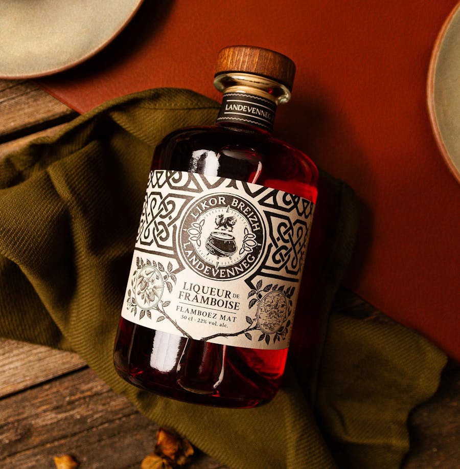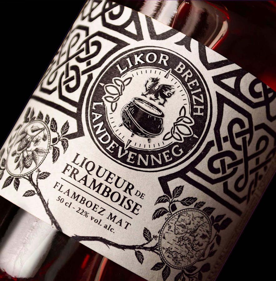 Les liqueurs Landevenneg ont été réalisé en s’inspirant de la mythologie celtique bretonne. Avant même l’ère chrétienne, la région était un lieu de culte et de spiritualité pour les peuples celtes. Les motifs utilisés sur les étiquettes nous rappellent les motifs traditionnels bretons. Le logo tient une place centrale dans la composition globale. Les codes celtes et bretons côtoient le chaudron Landevenneg et le Red Lion.
