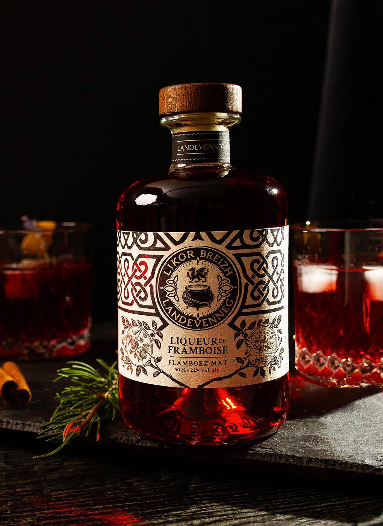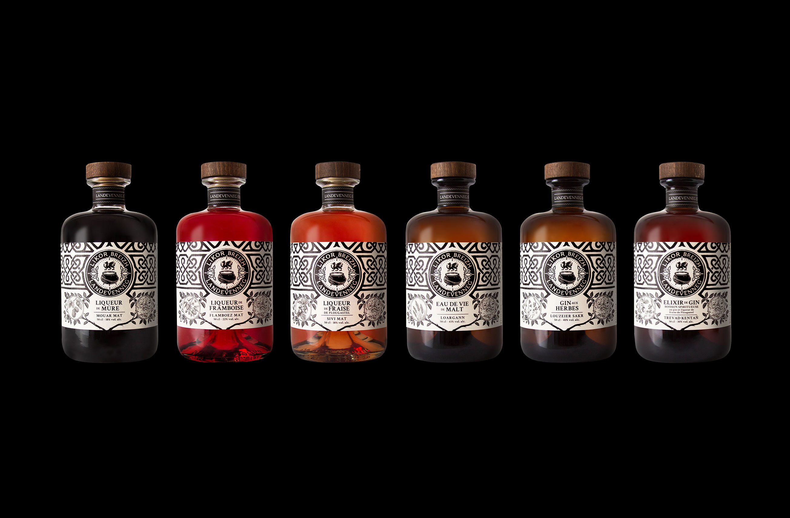 Les liqueurs Landevenneg ont été réalisé en s’inspirant de la mythologie celtique bretonne. Avant même l’ère chrétienne, la région était un lieu de culte et de spiritualité pour les peuples celtes. Les motifs utilisés sur les étiquettes nous rappellent les motifs traditionnels bretons. Le logo tient une place centrale dans la composition globale. Les codes celtes et bretons côtoient le chaudron Landevenneg et le Red Lion.