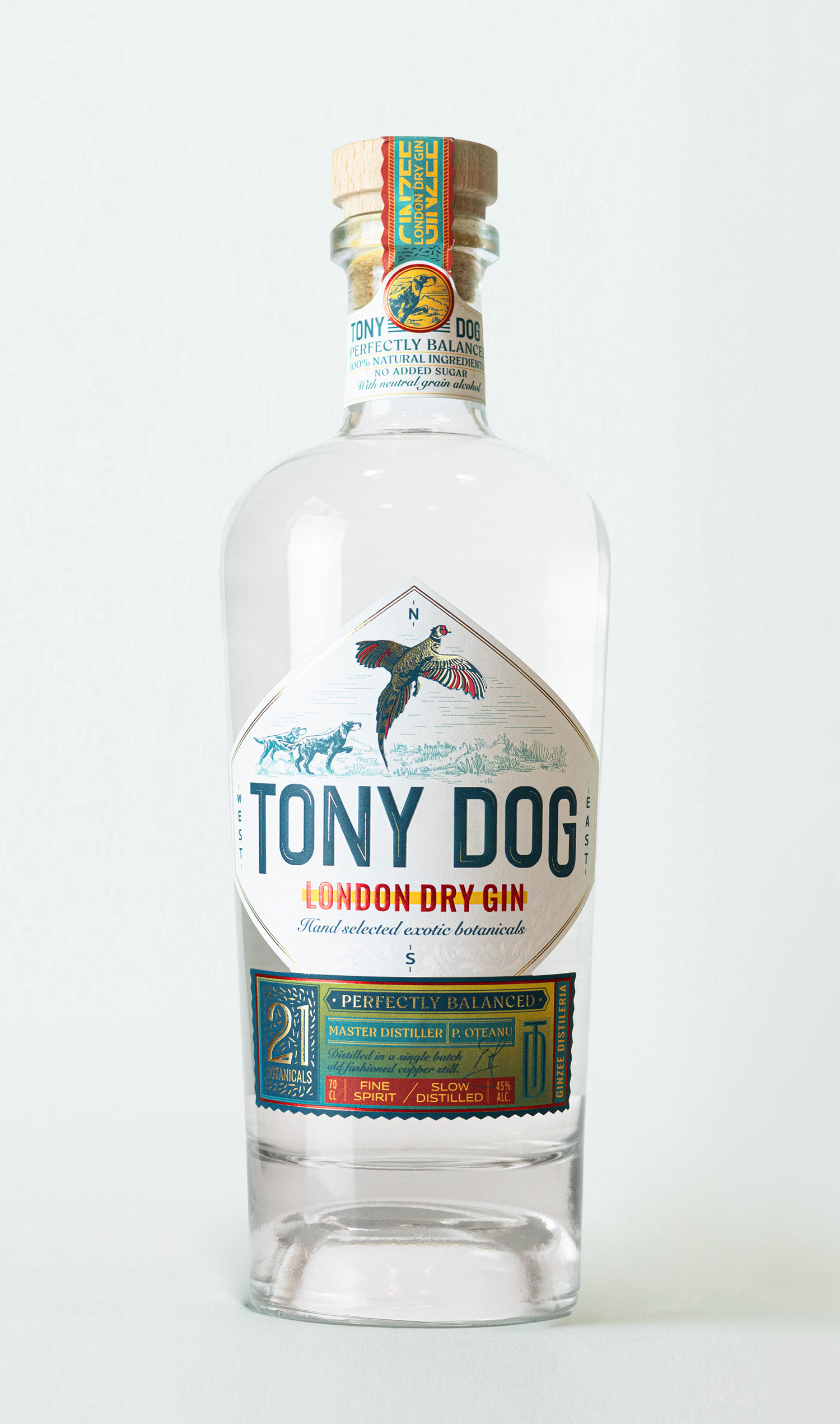 Tout comme les arômes du gin Tony Dog, la composition graphique est équilibrée et structurée. La partie supérieure de l'étiquette dépeint une scène de chasse, tandis que la partie inférieure contient les informations techniques du spiritueux. Les couleurs riches et saturées de l'étiquette confèrent à l'ensemble un aspect moderne et contemporain.